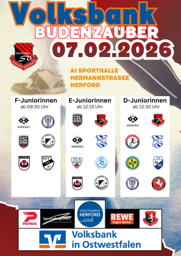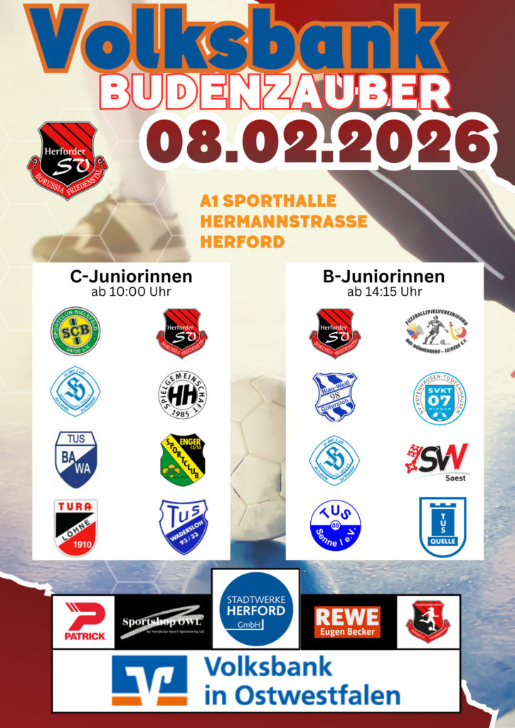 Am 7. und 8. Februar laden wir euch herzlich zum diesjährigen Volksbank Budenzauber ein.Das erwartet euch: Zwei Tage lang rollt der Ball bei den Juniorinnen – von den kleinsten Talenten der F-Juniorinnen bis hin zu den B-Juniorinnen. Wir freuen uns auf ein tolles Teilnehmerfeld mit Mannschaften aus der Region und darüber hinaus. Spannende Duelle und echter Teamgeist sind garantiert!